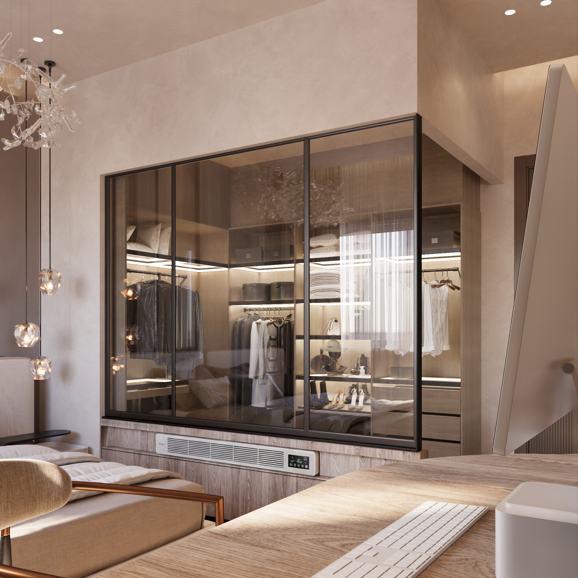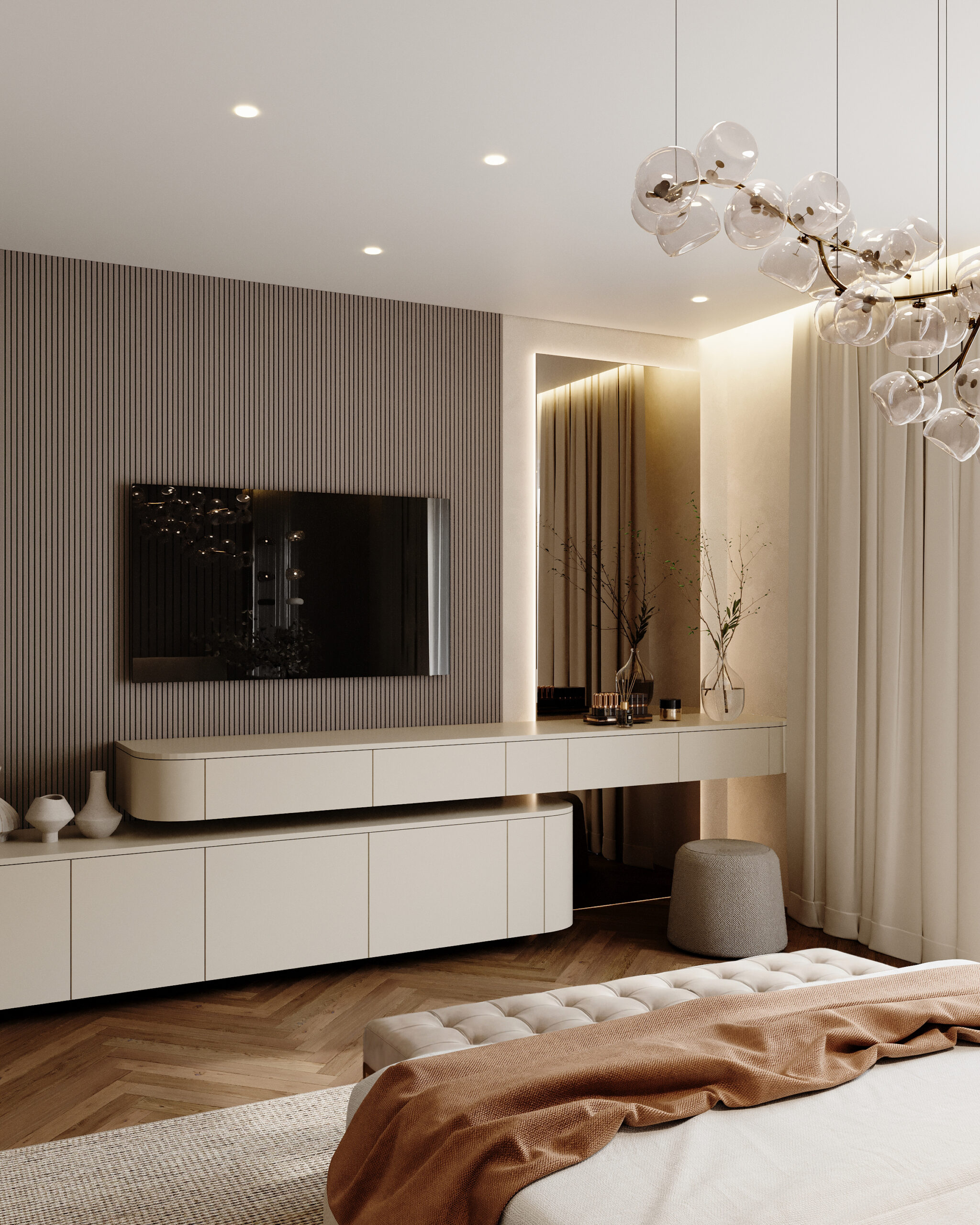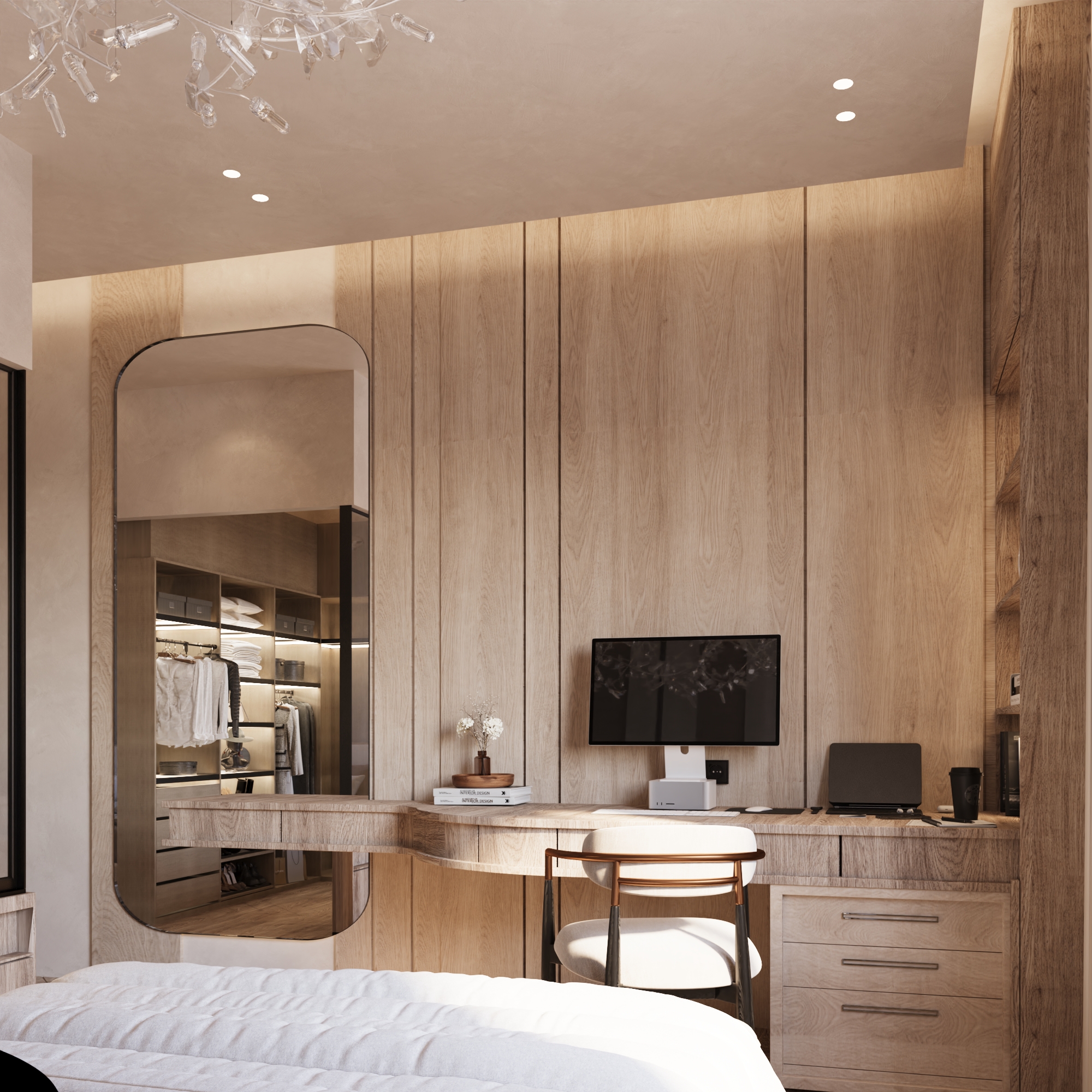 Conceived as a peaceful coastal retreat, the master bedroom reflects a balance of modern comfort and understated elegance. Soft neutral hues, refined materials, and well-proportioned layouts create a serene atmosphere that encourages rest, privacy, and effortless living.